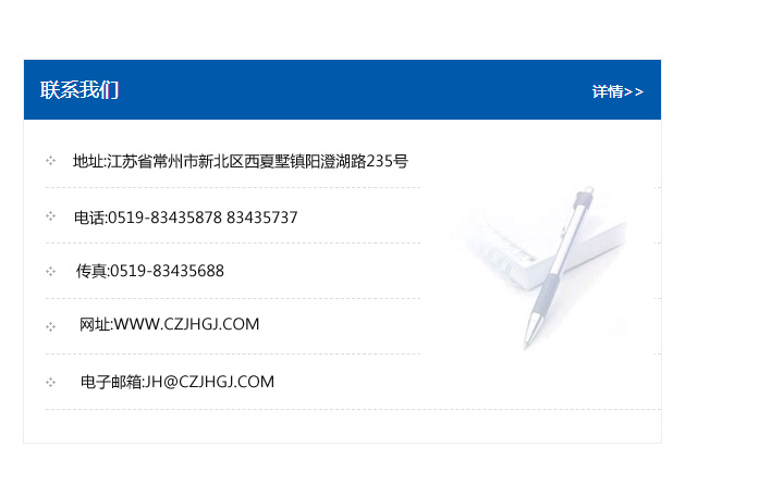 地址:常州市新北區友邦商務大廈1幢16、17層  電話:0519-85101652  傳真:0519-85112595  郵編:213022  網址:www_cz-jiayue_cn.gzdajing.com  郵箱:xiajifengaa@163.com